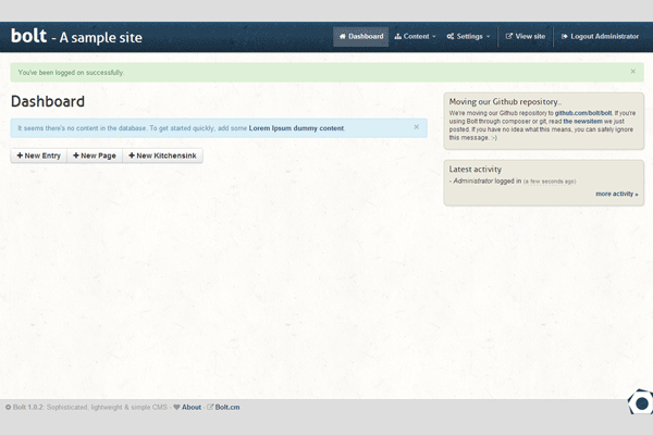 Bolt is a tool for Content Management, which strives to be as simple and straightforward as possible. It is quick to set up, easy to configure, uses elegant templates, and above all: It's a joy to use. Bolt is created using modern open source libraries, and is best suited to build sites in HTML5 with modern markup. From a technical perspective: Bolt is written in PHP, and uses either SQLite, MySQL or PostgreSQL as a database. It's built upon the Silex framework together with a number of Symfony components and other libraries.