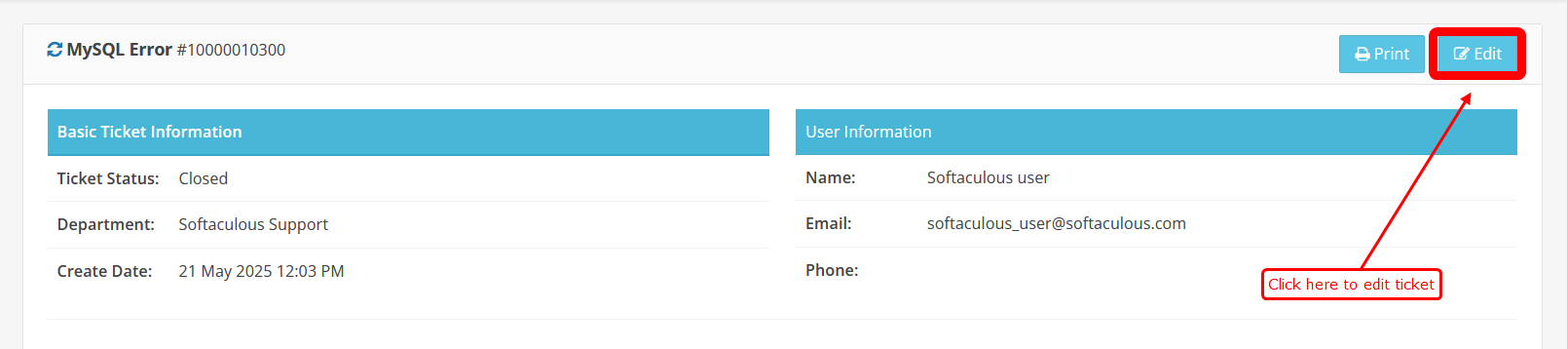 3. Click the Edit button at the top-right of the page. This will open the ticket’s configuration where you can find the Server Login Credentials section.
